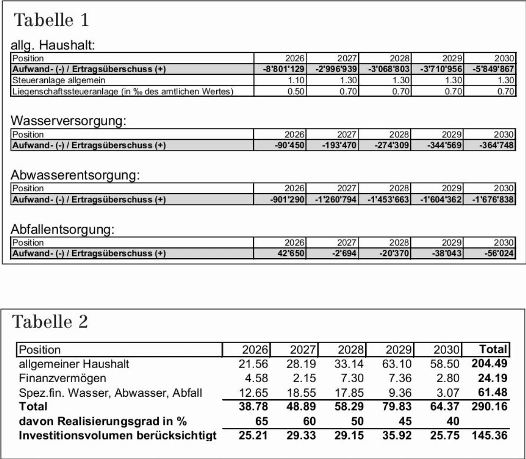 Der Finanzplan 2026–2030 wurde aufgrund der Eingaben aus den verschiedenen Fachbereichen erstellt, durch die Finanzkommission vorberaten und durch den Gemeinderat verabschiedet. Mit den nachstehenden Annahmen werden die folgenden Ergebnisse prognostiziert (Tabelle 1).