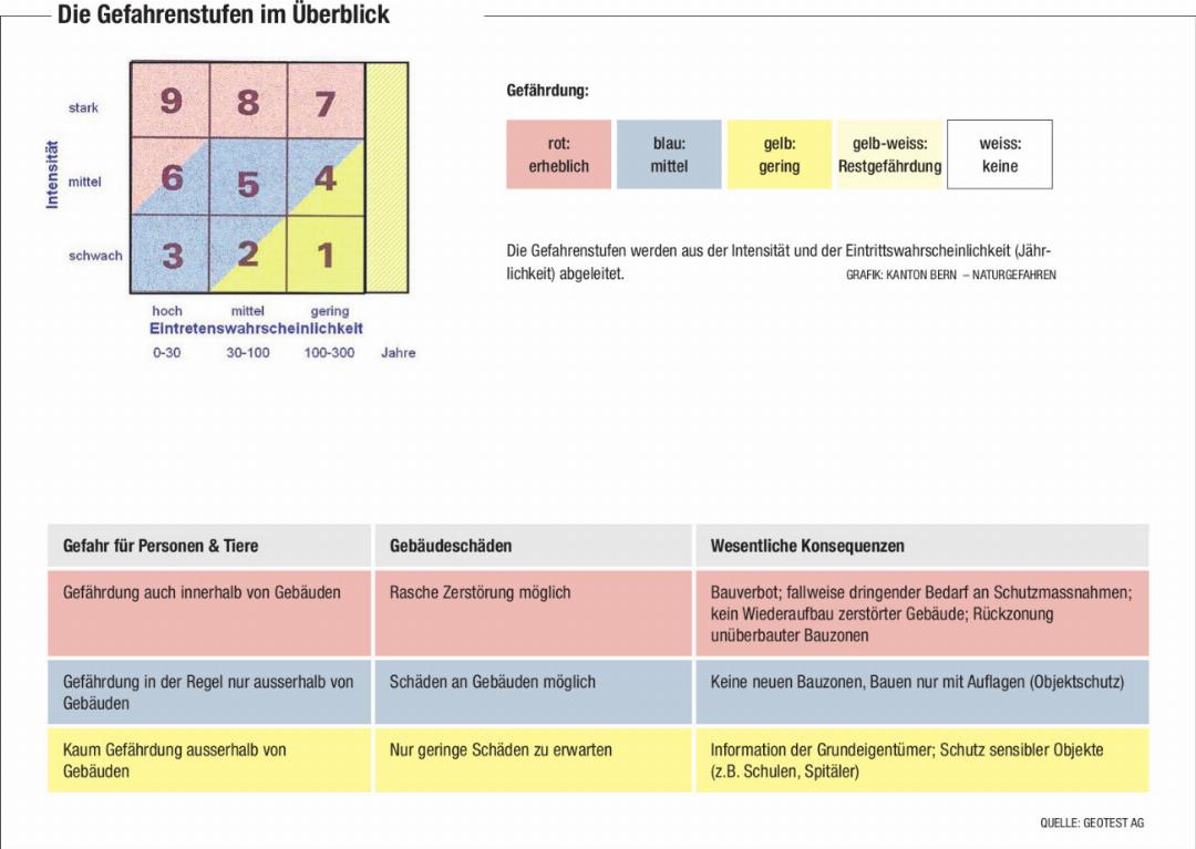 • In der blauen Gefahrenstufe ist in der Regel ein Gefahrengutachten durch ein Fachbüro nötig (Bestimmung der Einwirkungen, Vorschläge für Schutzmassnahmen)