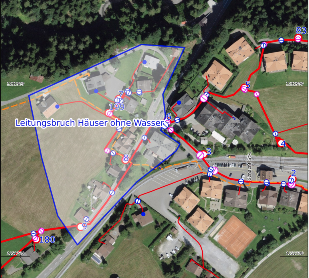 Der Grund für den Wasseraustritt sei ein Teilstück der Hauptwasserleitung gewesen, das geborsten sei. Am 4. Dezember habe die Wasserversorgung um 11.45 Uhr einen aussergewöhnlich hohen Wasserverbrauch im Netz registriert. Zwischen 12.00 und 12.30 Uhr floss die maximale Wassermenge aus, anschliessend wurde der Austritt schrittweise reduziert. «Rund eine Stunde nach der ersten Auffälligkeit konnte der Bruch kontrolliert werden», so Romang. Im betroffenen Gebiet (siehe Karte) kam es zu Unterbrüchen der Wasserversorgung. Die Inbetriebnahme sowie das Spülen der reparierten Leitung sei gemäss technischen Aufzeichnungen zwischen 19.30 und 20.00 Uhr erfolgt.