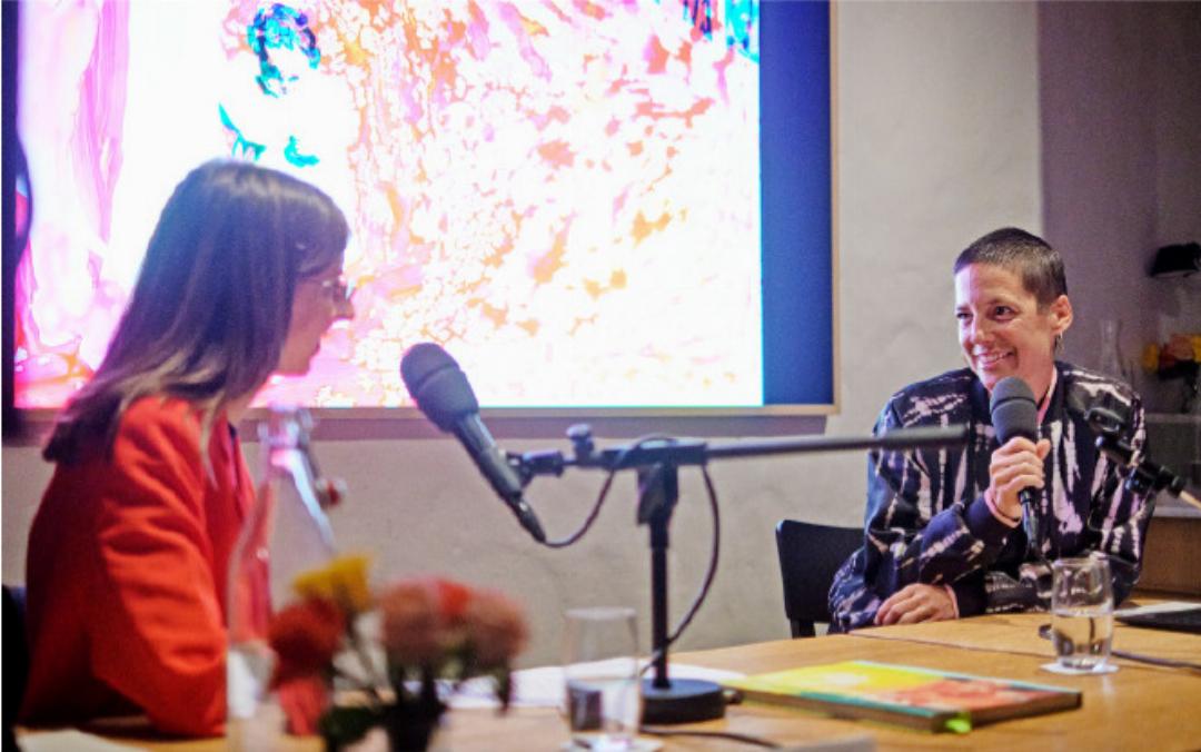 Dabei arbeitet sie mit wenigen Worten, dafür mit umso eindrücklicheren Illustrationen. Diese kommen mit ihren starken Farben im abgedunkelten Saal auf dem Grossbildschirm wunderbar zur Geltung. Im Anschluss bot der Apéro Gelegenheit, ein Buch signieren zu lassen. Wernli brachte sogar eine kleine Druckstation mit und individualisierte ihre Graphic Novel auf Wunsch mit einem passenden Sujet.