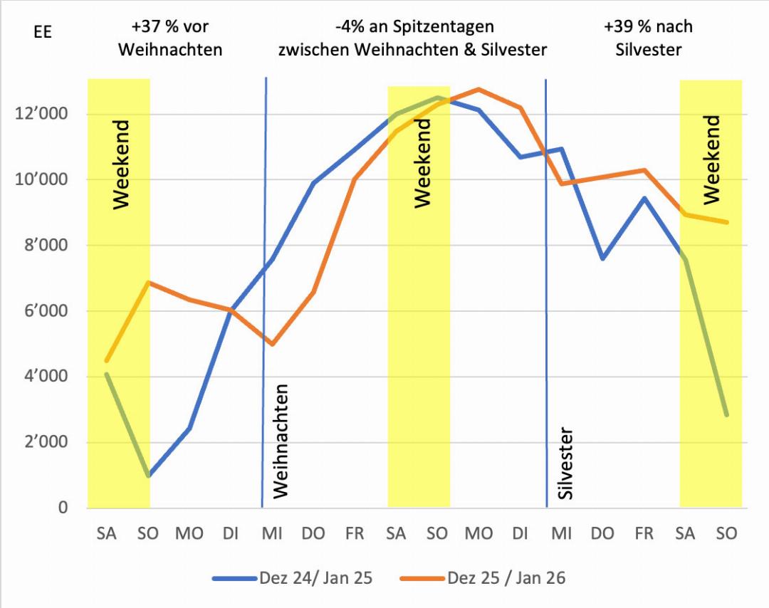 Während im Flachland über die Feiertage häufig Nebel herrschte, präsentierten sich die Berge mehrheitlich sonnig. Viele Gäste nutzten die Gelegenheit, um einige Sonnenstunden in der Höhe zu verbringen. Laut BDG lag über die Festtage die Gästezahl insgesamt auf gleichem Niveau wie im Vorjahr. Eine Grafik der BDG zeigt: Vor Weihnachten verzeichneten die Bahnen 37 Prozent mehr Ersteintritte als im Vorjahr, 39 Prozent nach Silvester. An den Spitzentagen zwischen Weihnachten und Silvester verzeichnete das Unternehmen vier Prozent weniger Ersteintritte gegenüber dem Vorjahr.