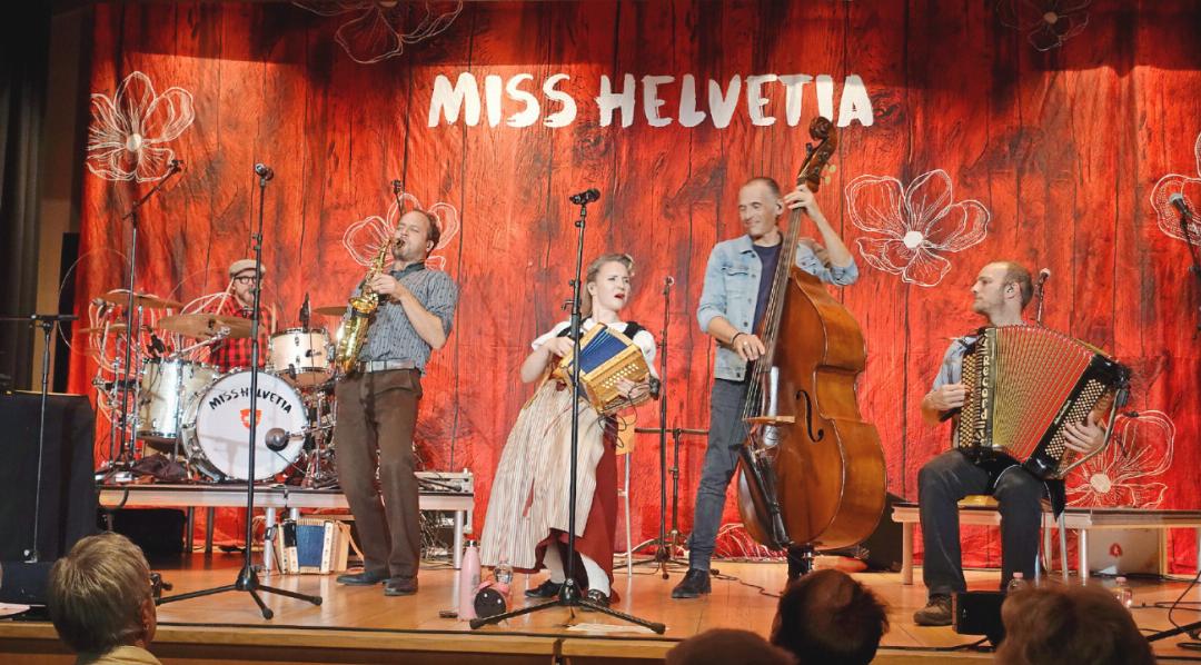 Nebst dem Multiinstrumentalisten Tobias König aus Zweisimmen wurde «Miss Helvetia» auf ihrer Schweizer Tour von ihrer spielfreudigen Band begleitet: Mit Beat Schürpf am Schlagzeug, Patrik Meier am Kontrabass, Simon Lüthi an der Handorgel sowie Frank Niklaus an der Gitarre standen ihr hervorragende Musiker zur Seite, die «Miss Helvetia» jedoch klar das Rampenlicht überliessen und sich diskret im Hintergrund hielten. Gemeinsam präsentierten sie während über zwei Stunden Lieder von ihrer «Volksmusig on the Rocks»-CD und schlugen dabei gekonnt Brücken zwischen traditioneller Schweizer Volksmusik, Jodelgesang sowie unbeschwerter rockiger Unterhaltung und französischem Chanson.