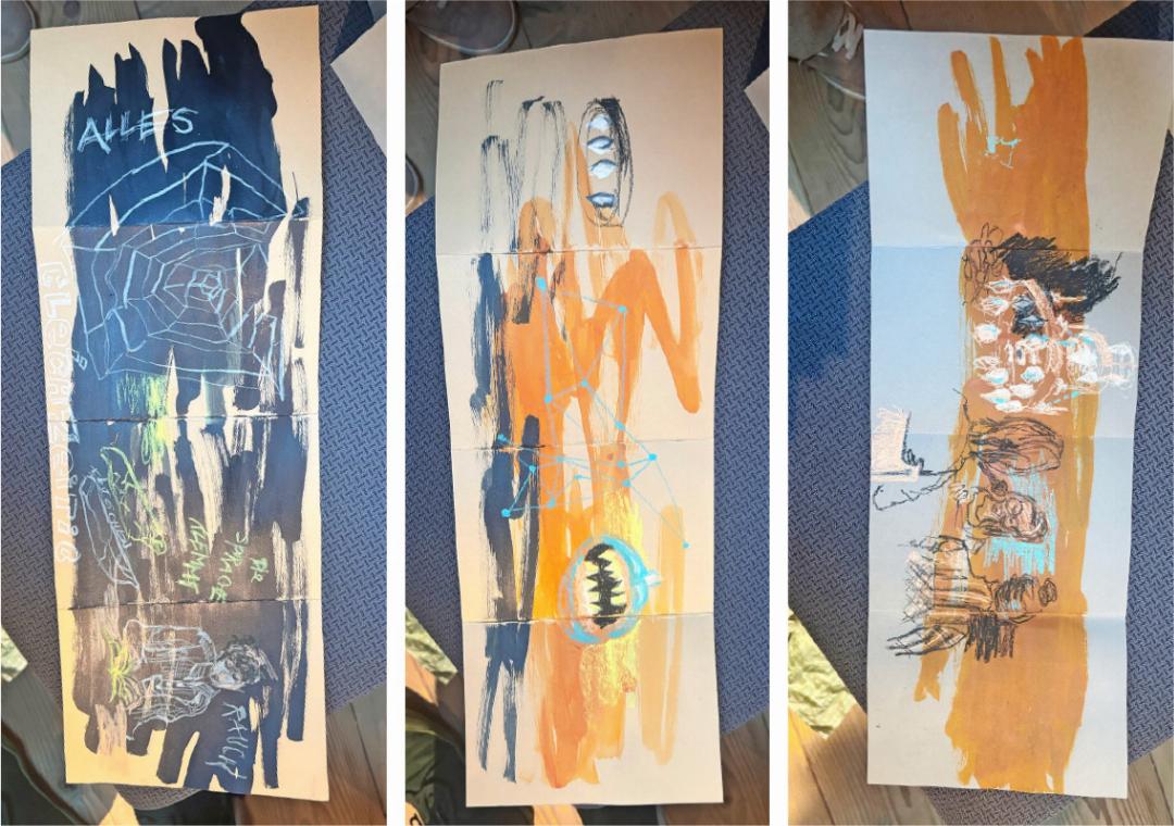 Während der Nachmittagslesungen im kleinen Landhaus wird dann skizziert und gemalt. Farbiges Papier, kleine Leporellos mit Farbtupfern, kleine Formate. Hauptsache das Papier ist nicht weiss. Die begeisterten Teilnehmer:innen lassen sich auf den Prozess ein, sind gespannt, wie es weitergeht. Während der Lesungen entstehen faszinierend vielseitige Kreationen: vom Einfangen der Raumstimmung über Gedanken zum vorgetragenen Text bis hin zur Abstraktion eines Möbelstückes oder Porträts der Autor:innen und Zuhörenden.