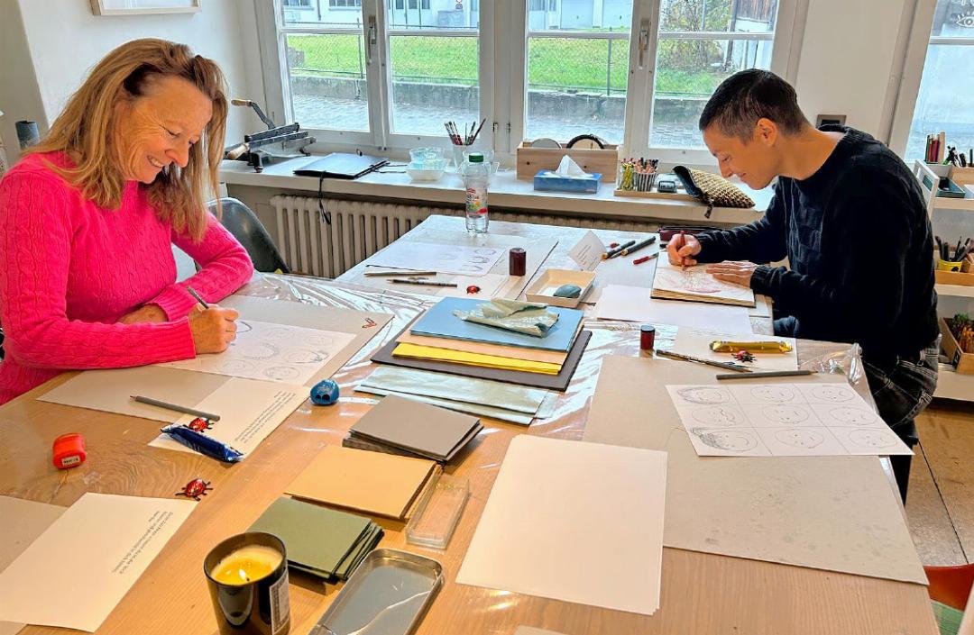 Am Vormittag «turnt sich die Gruppe zeichnerisch» in der Papierwerkstatt ein, wie Theres Rütschi erklärt.