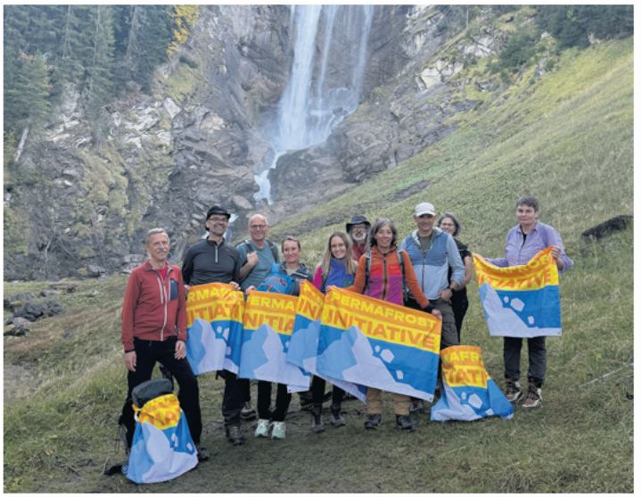 Um 9.25 Uhr versammelt sich die Gruppe am Bahnhof Lenk. Der Buschauffeur fragt neugierig nach den Fahnen und erfährt, dass wir in friedlicher Art auf den schwindenden Permafrost aufmerksam machen. Nach einer kurzen Busfahrt und gegenseitiger Vorstellung führt der Weg den rauschenden Simmenfällen entlang bis zu den «sibe Brünne». Dort gibt es ein Gruppenfoto und ein Gespräch über die geplante Permafrostinitiative im März 2026.